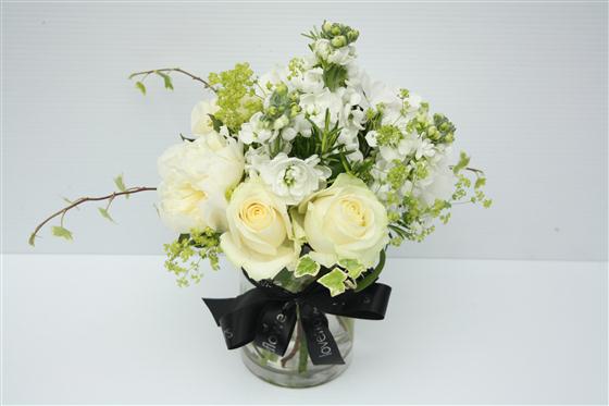 A dainty vintage style display of white and cream summer stems including stocks and roses.