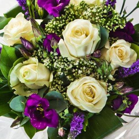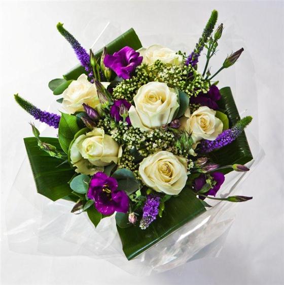 White roses, purple lisianthus and veronica arranged in a contemporary hand-tied bouquet.