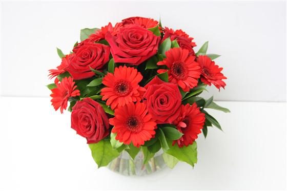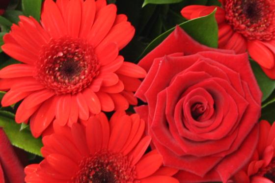 A ruby red bouquet of gerberas and rich, red roses interspersed with dark green foliage.
