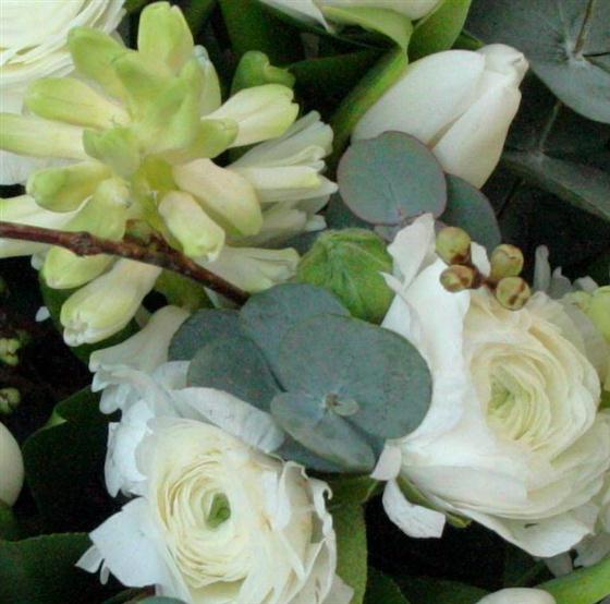A truly lovely bouquet including white ranunculus, tulips, hyacinths and apple blossom.